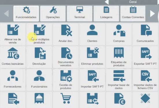 No ecrã inicial do Gestwin POS, aceda a Funções, na barra de funções e de seguinda seleciona as opções Funcionalidades -> Alterar Múltiplos Produtos.