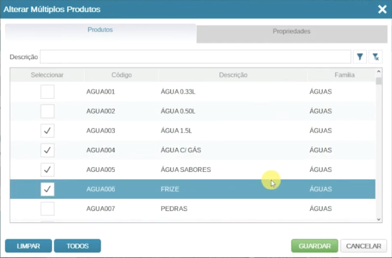 Na janela Alterar Múltiplos Produtos no separador Produtos, selecione os produtos que deseja alterar, ativando a checkbox correspondent.