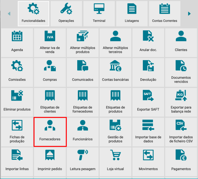 No meu principal vá a Funções -> Funcionalidades -> Fornecedores