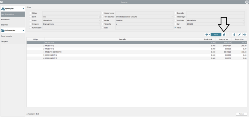 Para copiar um produto ou serviço, selecione o produto ou serviço que quer copiar e clique em Copiar