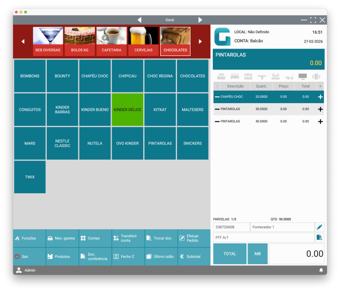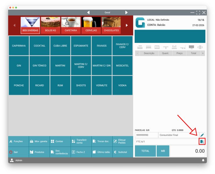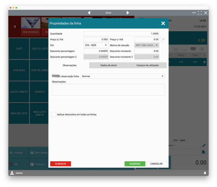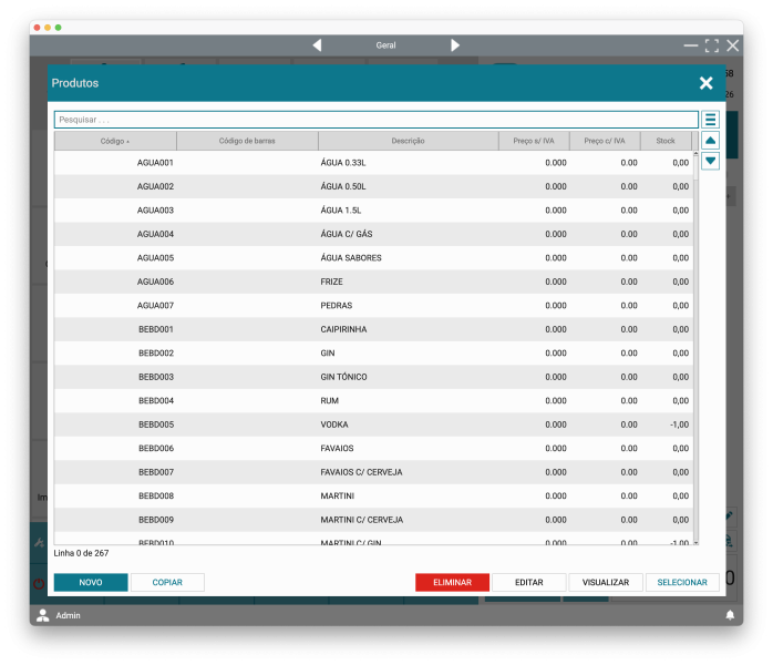 Insira produtos no documento através do ecrã principal ou através do menu Funções -> Funcionalidades -> Gestão de produtos.