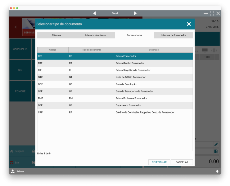 Exemplo prático: para lançar uma fatura recebida, selecione Fatura Fornecedor (FF).