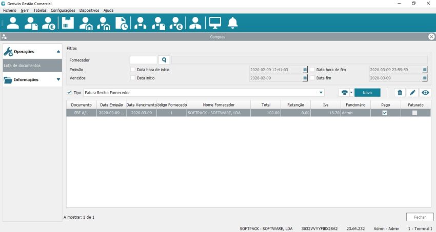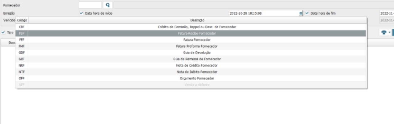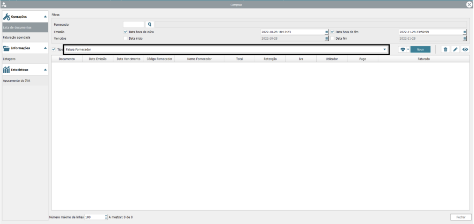 O próximo passo será selecionar o fornecedor para o qual pretendemos emitir o documento. Clicando no icon lupa junto do campo Fornecedor.