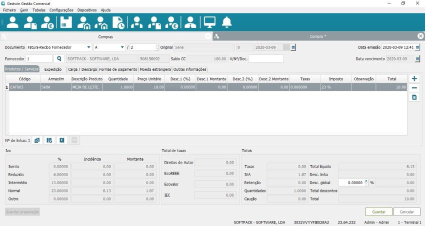 Fatura-Recibo Fornecedor: regista uma fatura já paga no momento da compra.