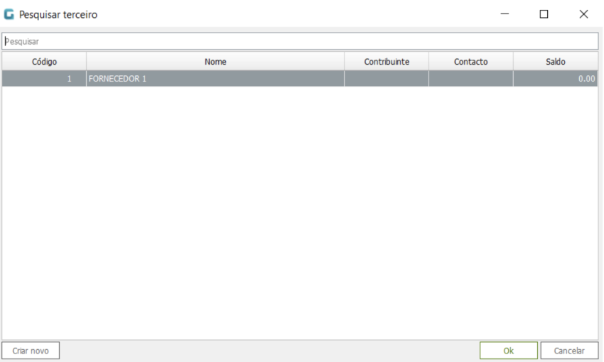 Selecione um fornecedor da lista e clique em OK. Caso o fornecedor ainda não exista, pode criar um novo cliente, clicando em Criar novo.