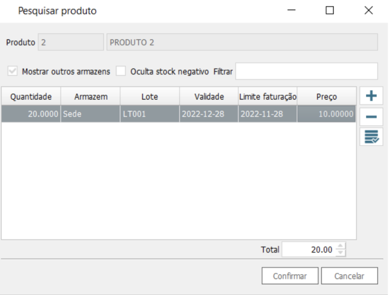 Ao lançar uma compra de produtos com controlo de stock por lote abrirá uma janela para preencher a Quantidade, Preço, Lote, Lote validade, Limite de Faturação, escolher o Armazém. Depois clique em Confirmar. Clique no + para adicionar uma linha e preencha os campos.