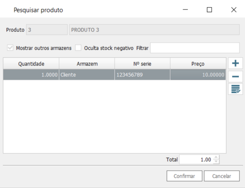 Ao lançar uma compra de produtos com controlo de stock por série abrirá uma janela para preencher o Preço, Série, escolher o Armazém e depois clique em Confirmar. Clique em + para adicionar uma linha e preencha os campos.