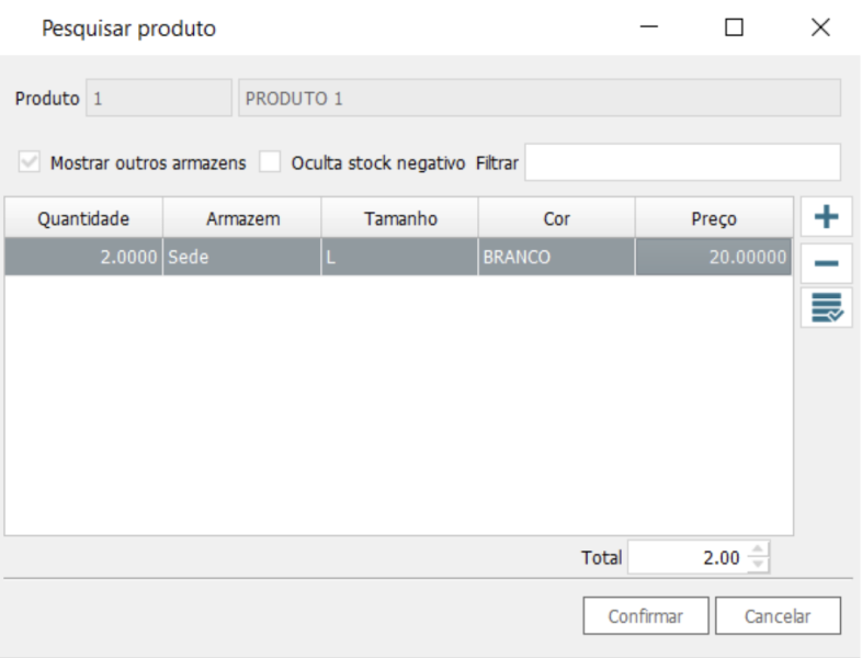Ao lançar uma compra de produtos com controlo de stock por tamanho e cor abrirá uma janela para escolher o tamanho e a cor da compra e depois clique em Confirmar. Clique em + para adicionar uma linha e escolher o tamanho e a cor.