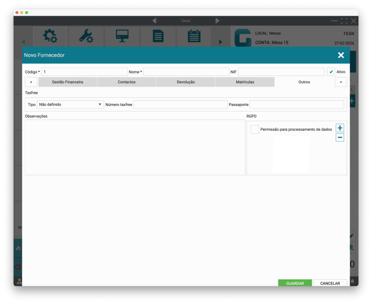 Tipo (Taxfree): Define se o fornecedor está enquadrado em regime Taxfree.