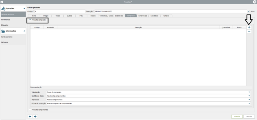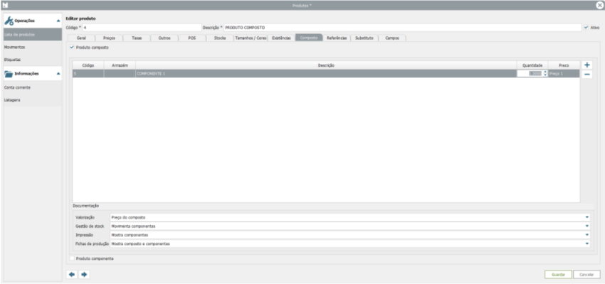 - Movimenta composto e componentes – Movimentará o Stock do composto e dos componentes.