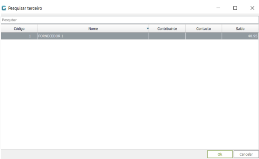 No campo Fornecedor, utilize a lupa para procurar o fornecedor. O sistema mostrará automaticamente o Saldo CC (Conta Corrente) atual do fornecedor.