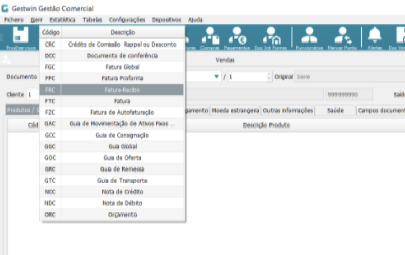 - Selecionar o tipo de documento (ex.: Fatura-Recibo, Fatura, Fatura Simplificada).
