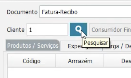 O próximo passo será selecionar o cliente para o qual pretendemos emitir o documento. Clicando na icon lupa junto do campo cliente.