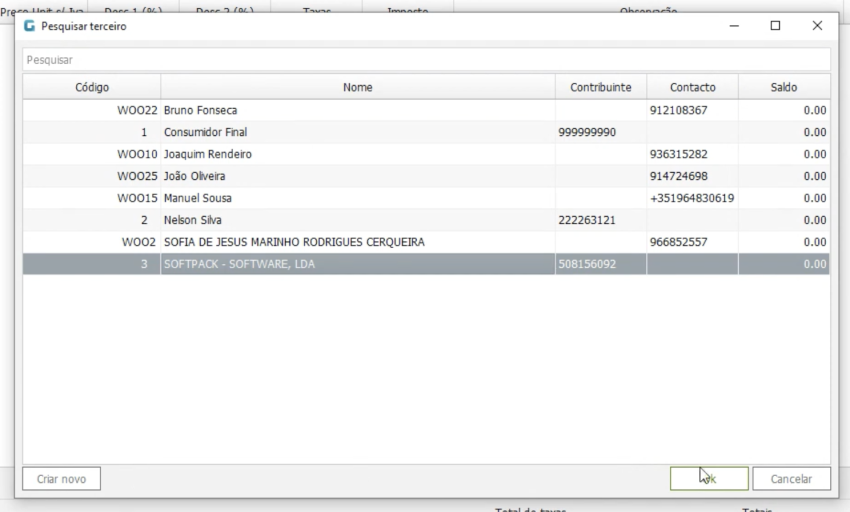 Selecione um cliente da lista e clique em OK. Caso o cliente ainda não exista, pode criar um novo cliente, clicando em Criar novo.