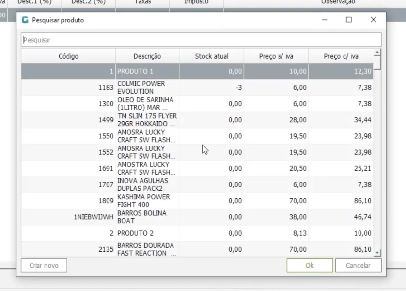 Selecione os produtos que deseja incluir no documento e clique em OK.