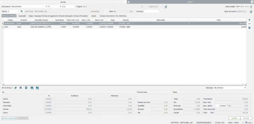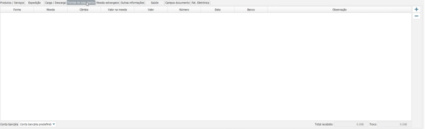 - Registar uma ou várias formas de pagamento do documento (se não acrescentar nenhuma, fica por defeito em numerário).