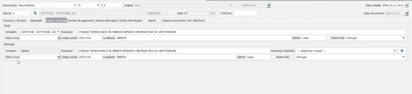 - Endereço: morada de carga, normalmente associada ao armazém selecionado.