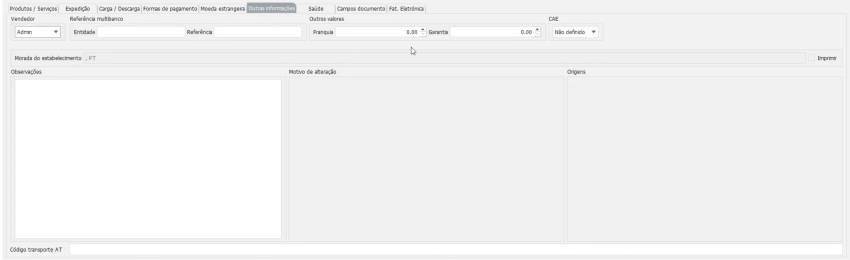 Este separador serve para registar informação complementar do documento, que não afeta diretamente valores, mas é importante a nível fiscal, operacional e informativo.