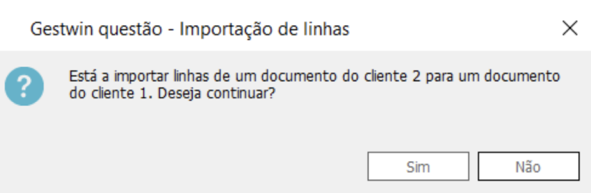 - O Gestwin apresentará um aviso: “Está a importar linhas de um documento do cliente 2 para um documento do cliente 1. Deseja continuar?”.