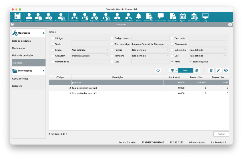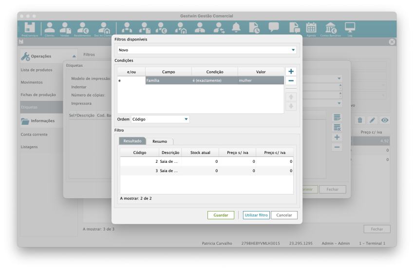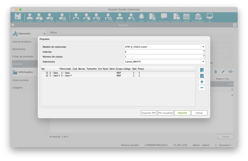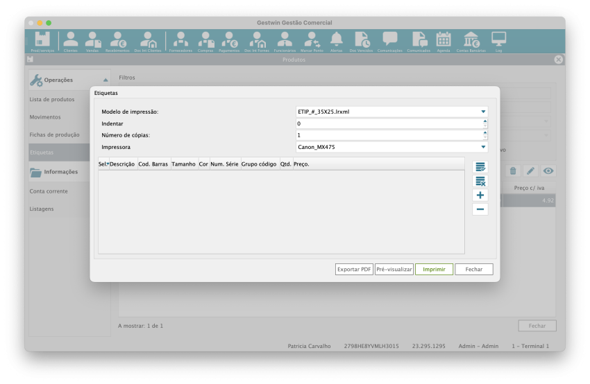 Este ecrã serve para configurar, selecionar e imprimir etiquetas de produtos, normalmente com: