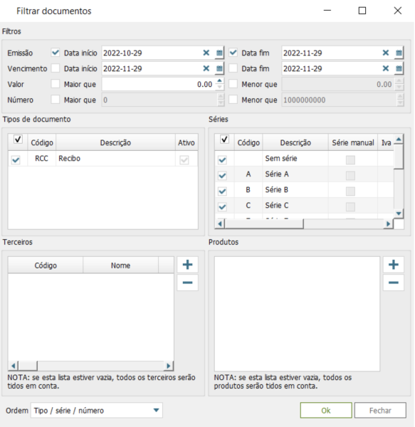 - Tipos de Documento e Séries: Selecionar apenas recibos (RCC), entre outros, bem como séries específicas (A, B, C).
