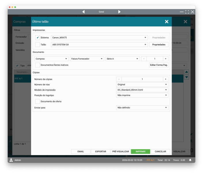 Tipo de documento: Ex.: Compras → Fatura Fornecedor.
