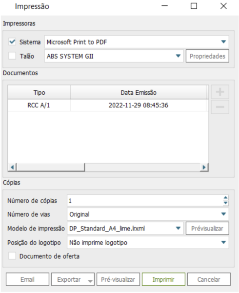 • Imprimir: Envia o documento diretamente para a impressora física selecionada.