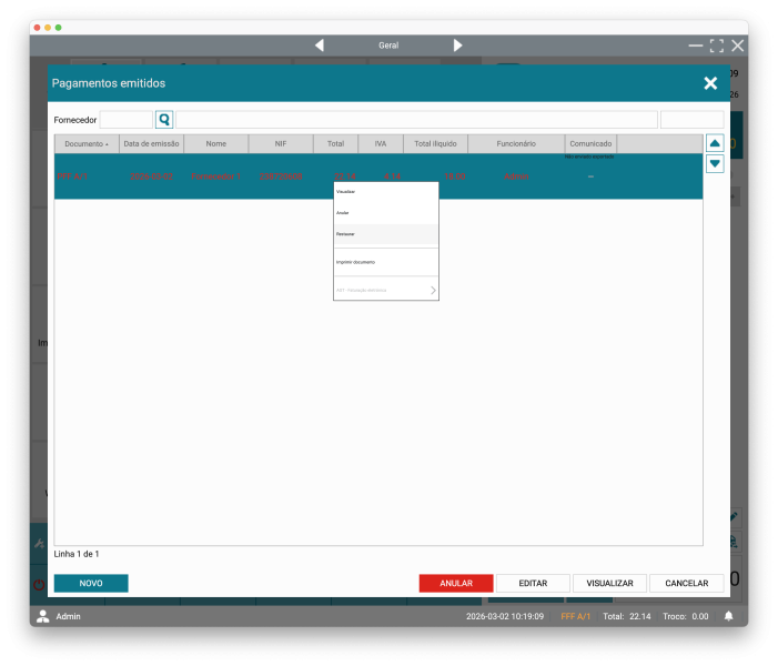 Sempre que um documento de pagamento tenha sido anulado por engano, pode restaurá-lo, desde que tenha permissões para o efeito. A restauração devolve o documento ao estado ativo.