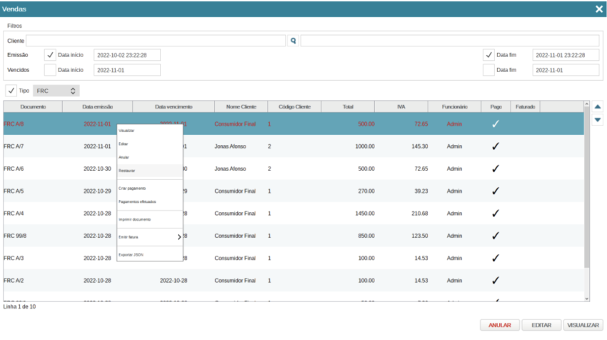 A funcionalidade Restaurar Documento permite reativar um documento previamente anulado, desde que cumpra as regras legais e permissões definidas no sistema. Esta opção é útil quando uma anulação foi efetuada por engano.