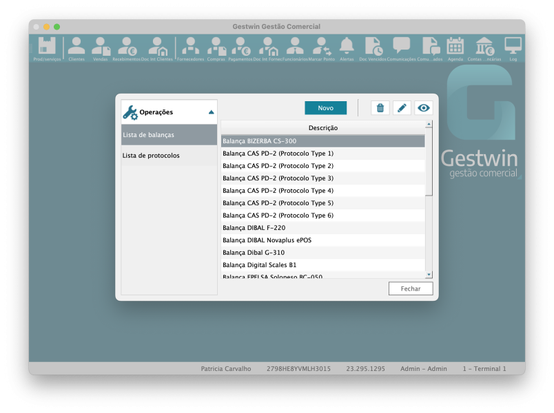 No menu Dispositivos -> Balanças vai poder visualizar as balanças e criar uma nova, caso o Gestwin não tenha a balança que quer configurar.