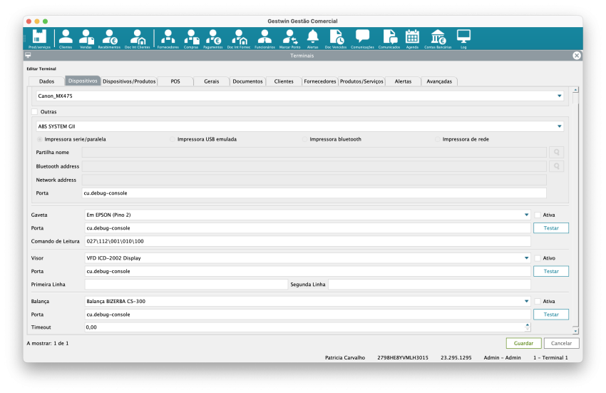 No menu Configurações -> Terminal. Vá até ao separador Dispositivos para escolher a balança que pretende usar.
