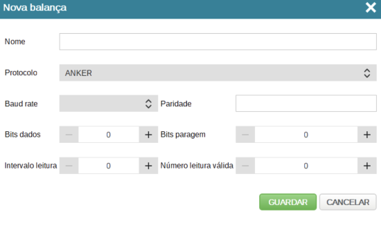 Uma vez na janela Nova balança preencha os campos e faça Guardar.