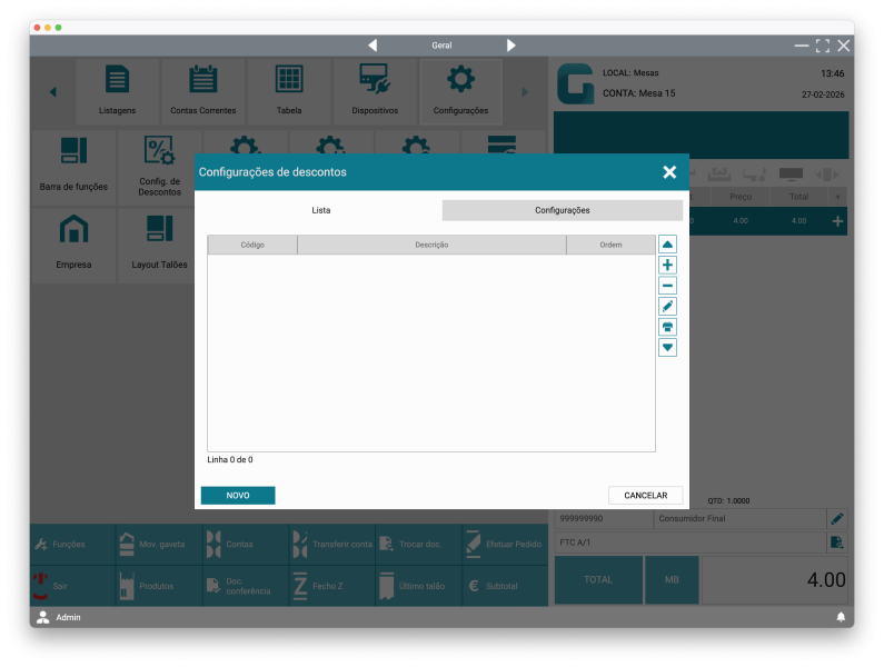 Aceda a Configurações → Config. de Descontos, clique em Novo, defina os dados do desconto e marque como Ativo.