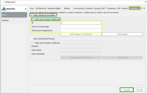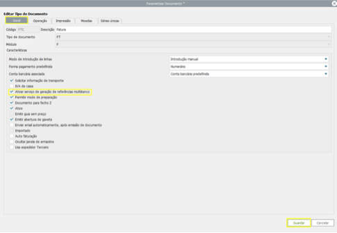 - 3. No separador Geral ative a opção Ativar serviço de geração de referências multibanco e faça Guardar.