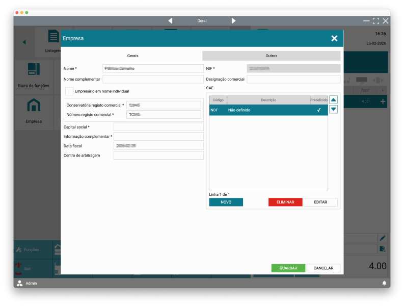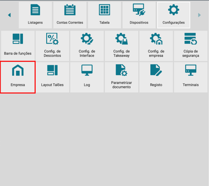 No ecrã principal vá Funções -> Configurações -> Empresa