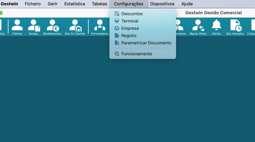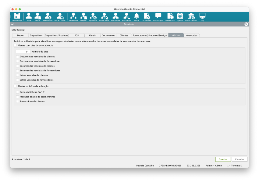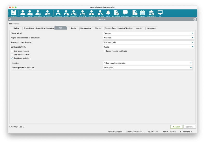 Este ecrã permite configurar o comportamento do terminal de faturação/POS, incluindo dados gerais, dispositivos, documentos, clientes, produtos e alertas.