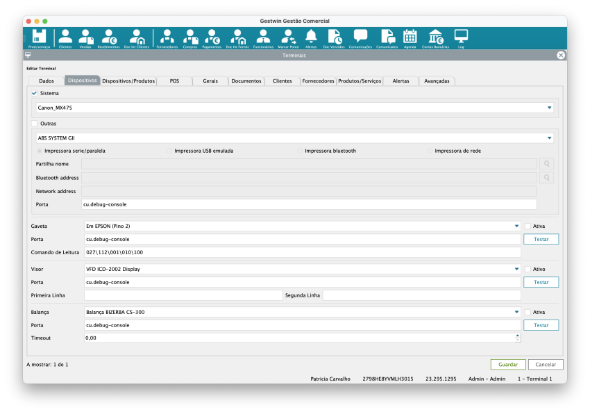 Aqui são configurados os equipamentos físicos ligados ao terminal.