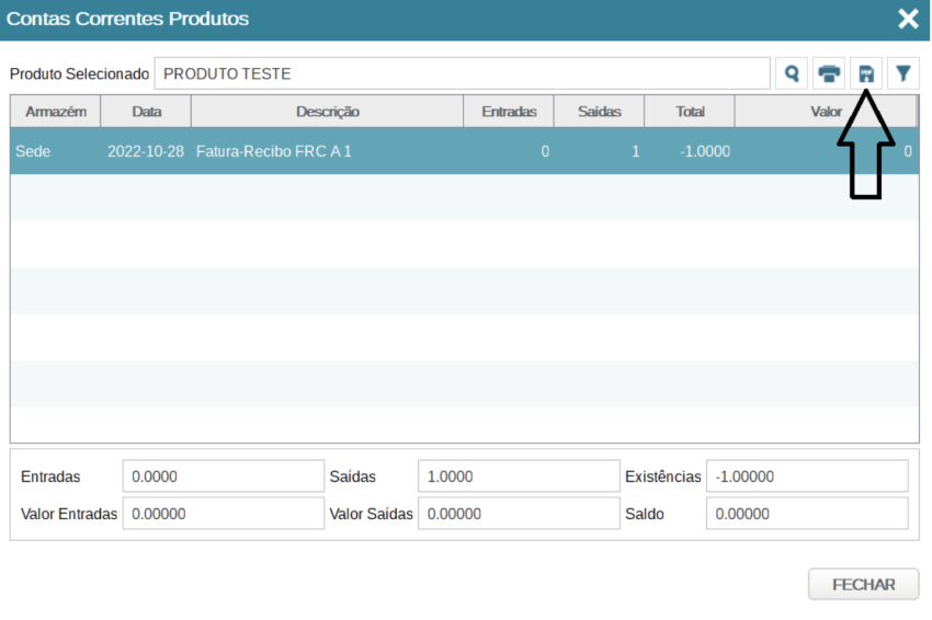 Se for emitida uma fatura com 1 unidade, surgirá 1 em Saídas, reduzindo o stock disponível.