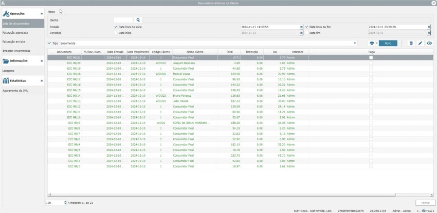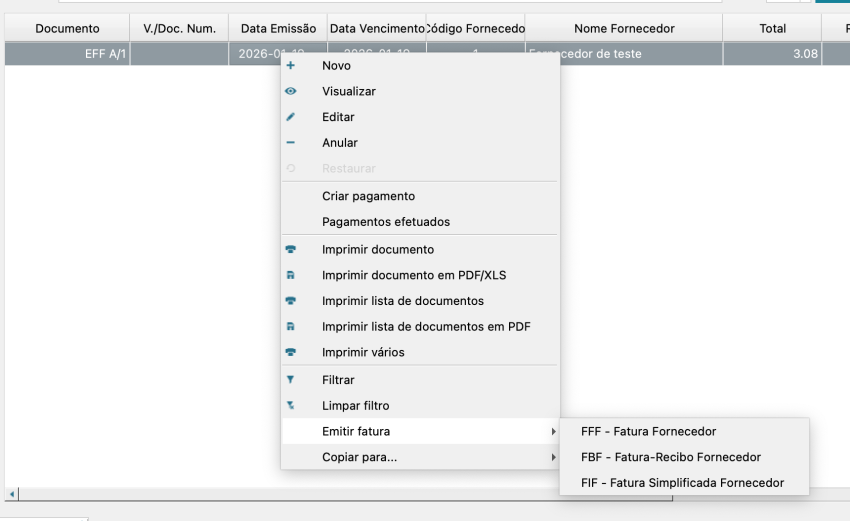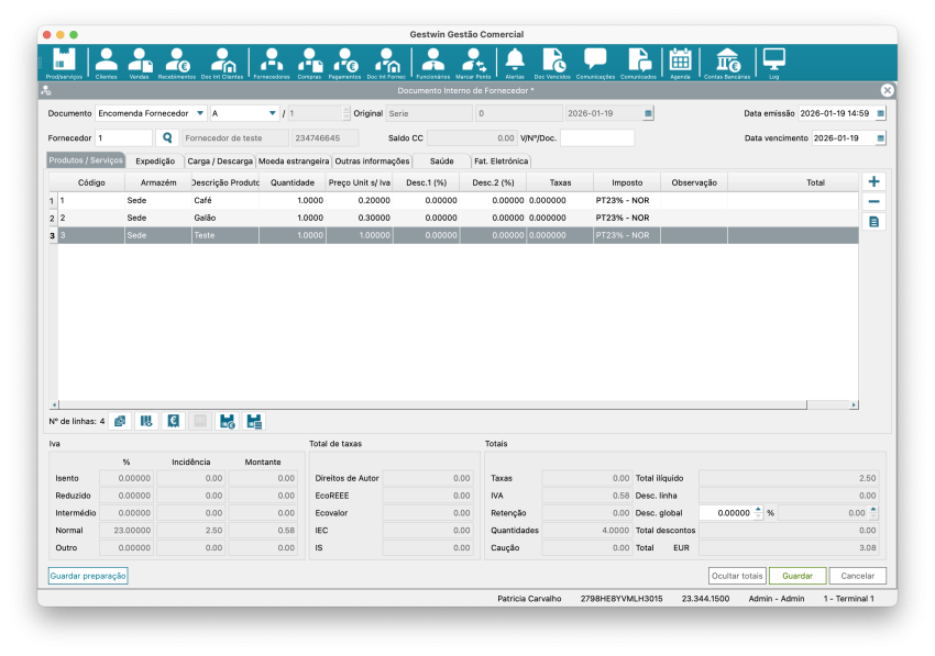 Documentos Internos de forncedor são documentos utilizados para registo e controlo interno da empresa. Ao contrário de faturas ou recibos, não têm validade fiscal, mas têm impacto direto na gestão de stocks, controlo financeiro interno e histórico de movimentos do cliente.
