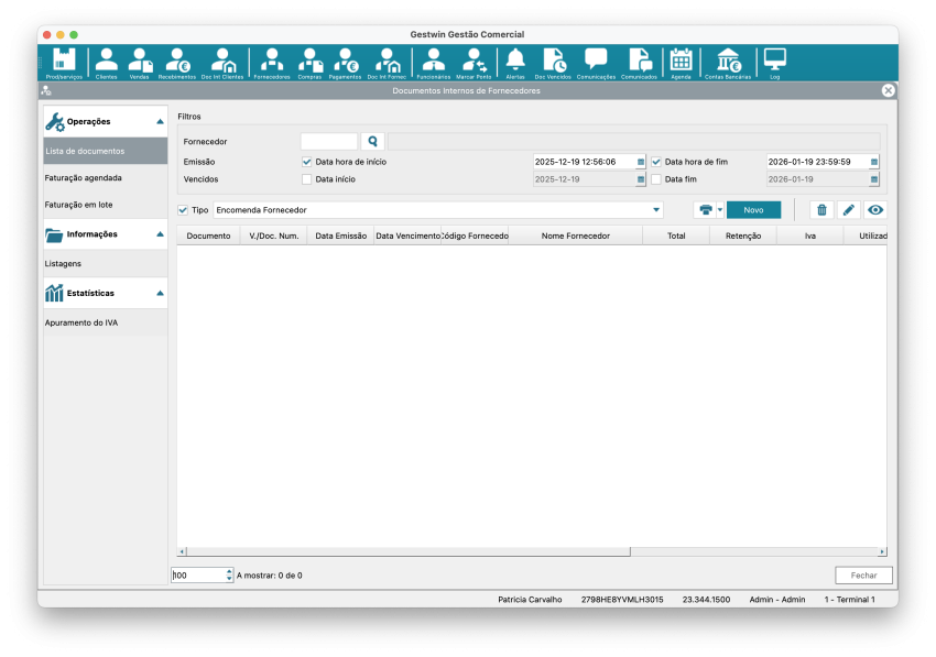 A partir do ecrã Documentos Internos de Fornecedor é possível: