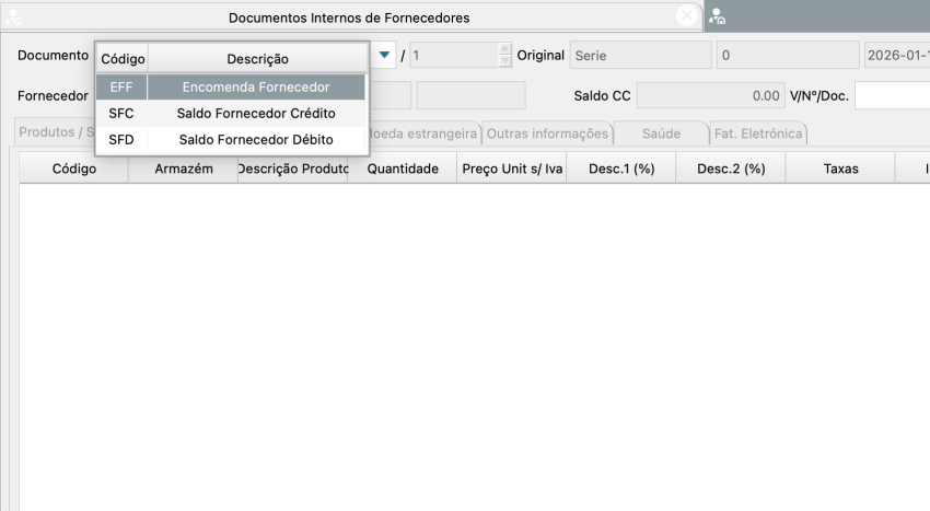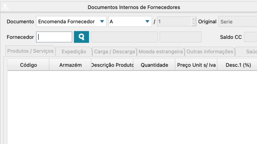 O próximo passo será selecionar o fornecedor para o qual pretendemos emitir o documento. Clicando na icon lupa junto do campo fornecedor.