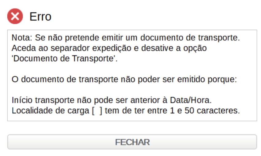 Se durante o processo de venda ao clicar em Total lhe aparecer o erro acima e não pretende emitir um documento de transporte no actual documento. Faça Fechar (na janela de erro) e clique em Subtotal (no ecrã de vendas).