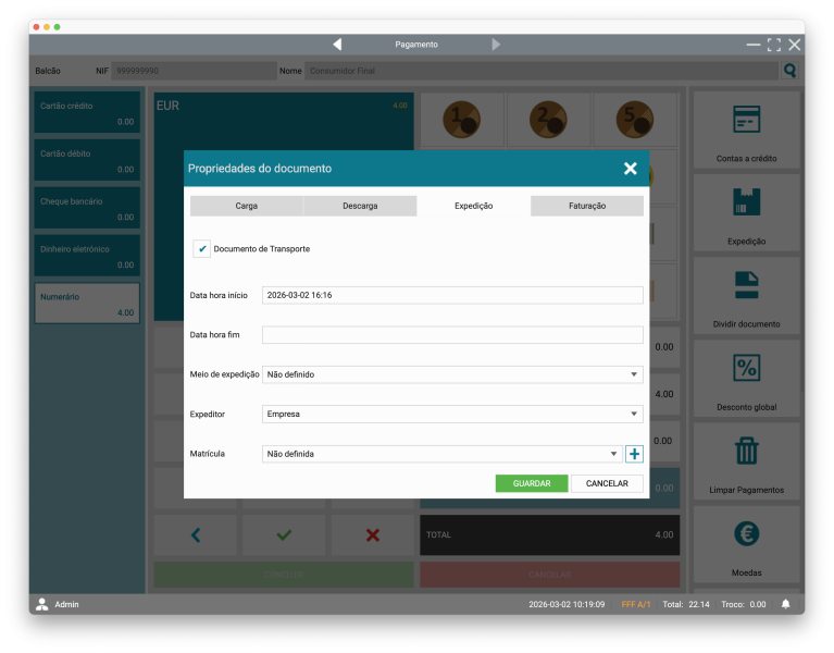 No ecrã de pagamento clique em Expedição e desactive a opção Documento de transporte e clique em Guardar.