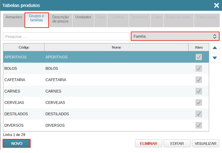 A janela Tabela de produtos vai abrir. Selecione o separador Grupos e famílias e selecione Família na caixa de escolha.