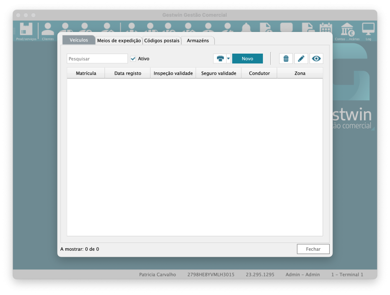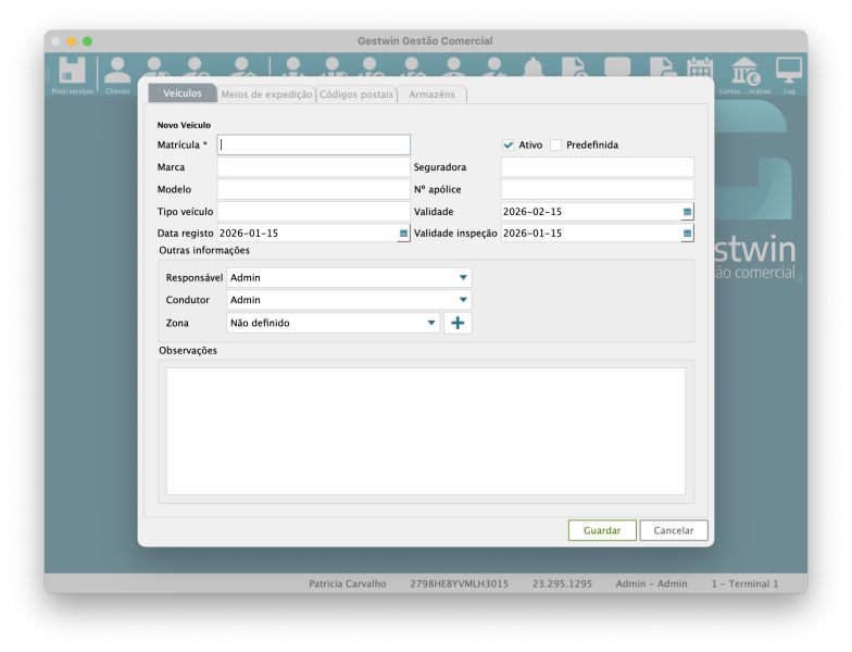 O separador Veículos é utilizado para o registo e gestão da frota associada à empresa. Em cada veículo são definidos dados como a matrícula, marca, modelo, tipo de veículo, datas de registo, validade da inspeção e do seguro, bem como a seguradora e o número da apólice. É ainda possível indicar se o veículo está ativo, se é predefinido, o responsável, o condutor habitual e a zona associada. Esta informação permite controlar a utilização dos veículos, garantir a conformidade legal e apoiar o planeamento logístico.