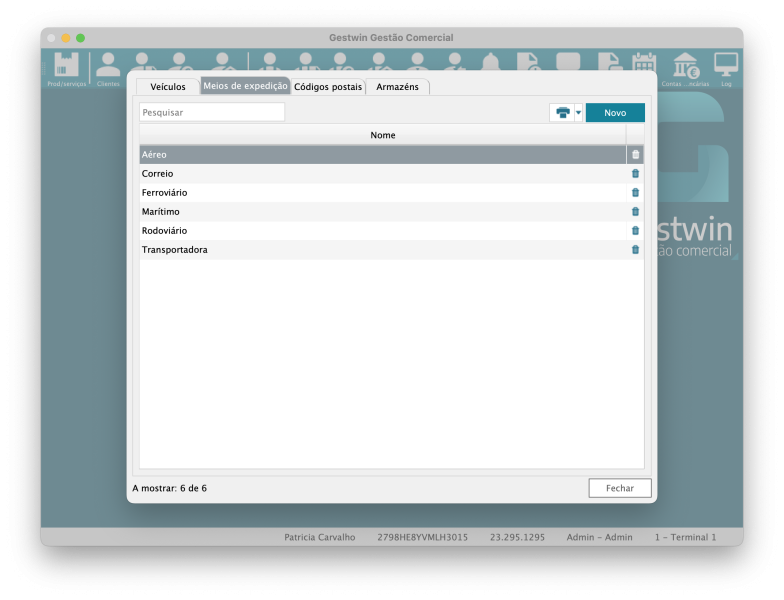 O separador Meios de expedição permite definir as diferentes formas através das quais as mercadorias são enviadas aos clientes ou transferidas entre locais. Aqui podem ser configurados meios como correio, transportadora, rodoviário, marítimo, ferroviário ou aéreo. Estes meios são depois utilizados nos documentos comerciais e logísticos, assegurando uma identificação clara do método de envio e facilitando o controlo e análise das expedições.