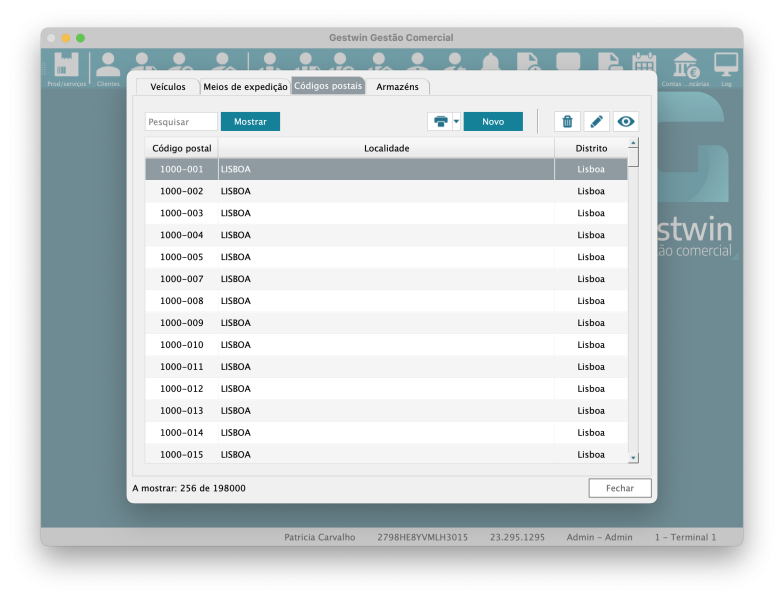 No separador Códigos postais encontra-se a base de dados de códigos postais, localidades e distritos. Esta informação é utilizada automaticamente no preenchimento de moradas em clientes, fornecedores, armazéns e documentos, reduzindo erros e garantindo consistência nos dados geográficos. Devido ao elevado volume de registos, este separador inclui ferramentas de pesquisa e filtragem para localizar rapidamente o código pretendido.