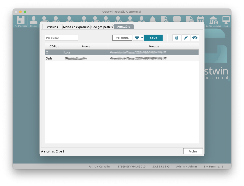 O separador Armazéns destina-se à criação e gestão dos locais físicos ou lógicos onde os produtos são armazenados. Em cada armazém são definidos o código, o nome e a morada, sendo possível visualizar a localização no mapa (se as coordenadas estiverem definidas). Os armazéns são utilizados na gestão de stocks, entradas e saídas de mercadoria, transferências internas e controlo de existências, permitindo uma organização clara e estruturada da logística da empresa.